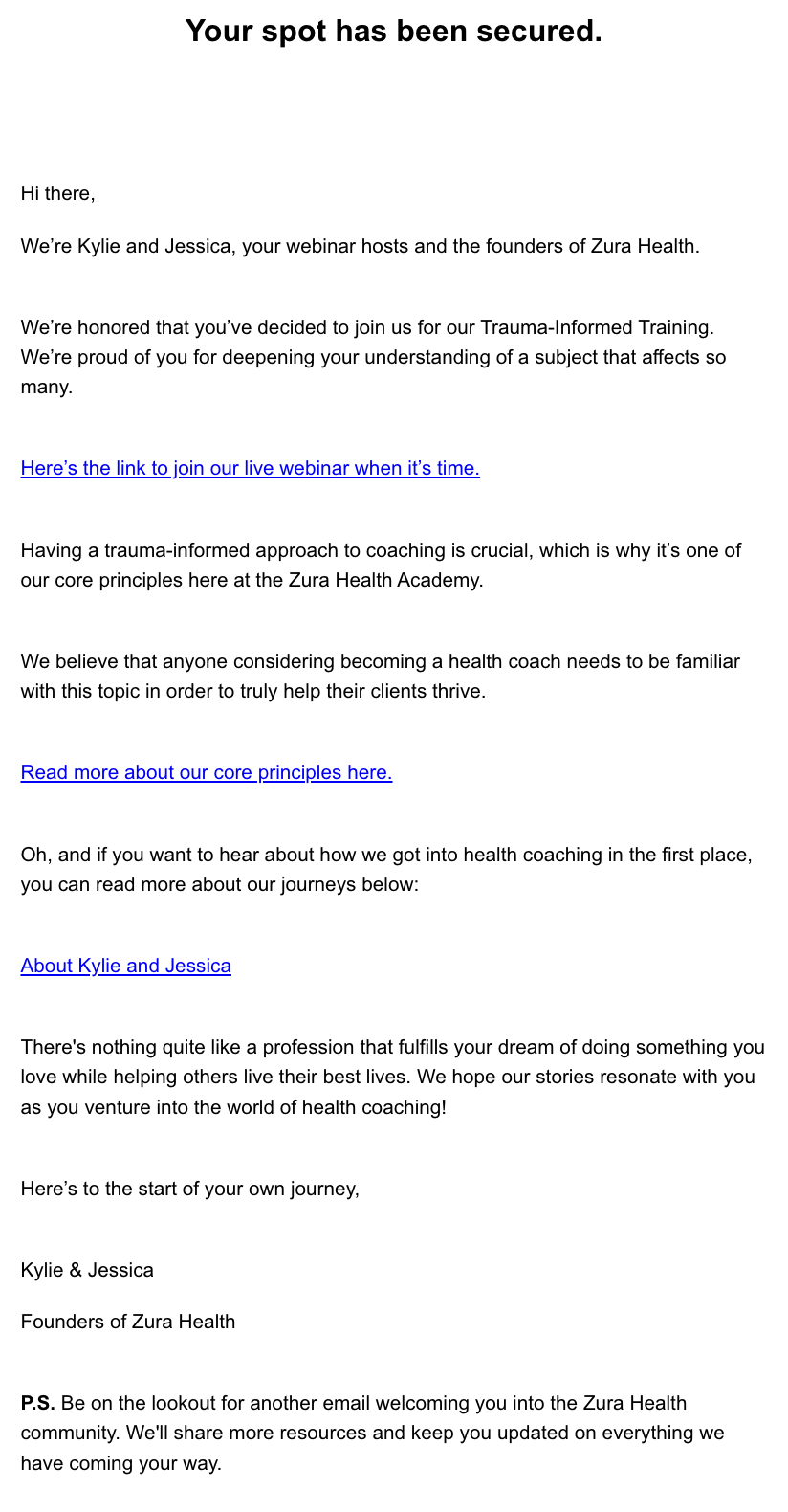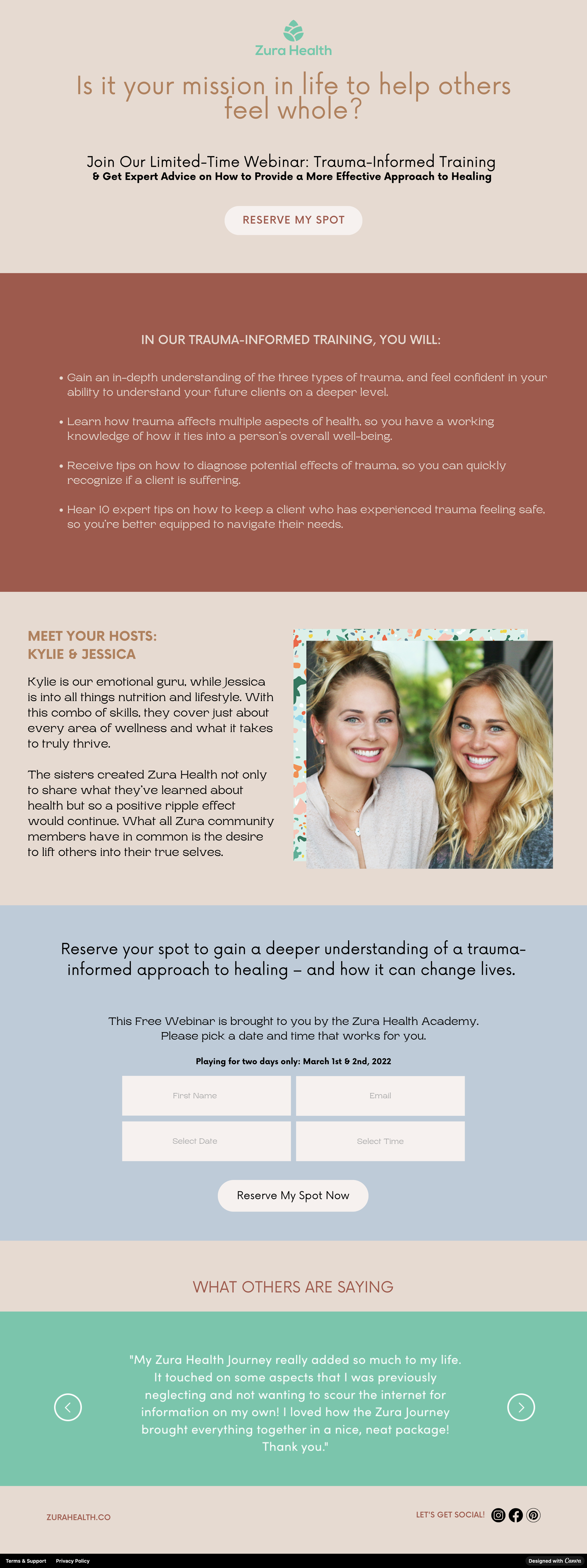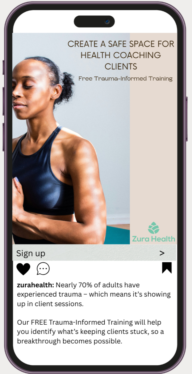 The Zura Health Coach Certification Program helps unfulfilled and overwhelmed health coaches learn how to build a thriving wellness business and make a living doing what they're passionate about. I created spec pieces, including social ads, a landing page, and email sequences to showcase my approach to funnel-based marketing.